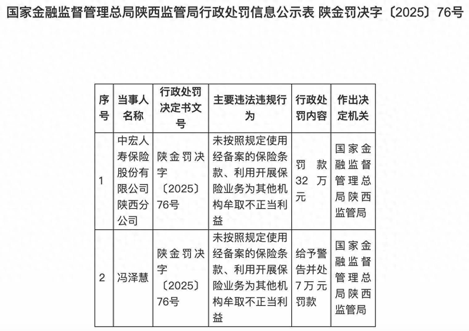 该公示表显示,由于未按照规定使用经备案的保险条款、利用开展保险业务为其他机构牟取不正当利益的违法违规行为,国家金融监督管理总局陕西监管局决定对中宏人寿保险股份有限公司陕西分公司罚款32万元;同时对冯泽慧给予警告并处7万元罚款。