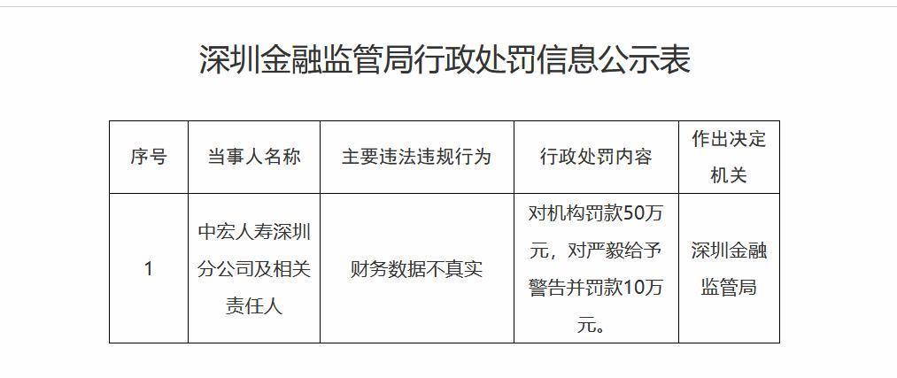 8月1日,深圳金融监管局行政处罚信息公示表显示,因财务数据不真实,中宏人寿深圳分公司被罚款50万元,责任人严毅被给予警告并罚款10万元。